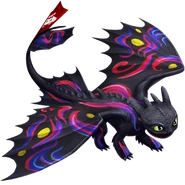 И какое ночное существо имеет более зловещую репутацию, чем Дредфольская Ночная Фурия. Он — свет в тени, подсвеченный изнутри биолюминесцентными водорослями. Мертвая голова украшает его лицо, как рана, обнажающая череп под чешуей. Он един с тьмой, порхая сквозь щель между мирами. Коварное трепетание его крыльев проникает в ночные кошмары любого ребенка-викинга, который его слышит, заглушая звуки их криков, когда они ворочаются в беспокойном сне... ... Или, по крайней мере, так чувствует себя Беззубик, когда наносит на лицо дредфольскую краску. Для любого наблюдателя Дредфольская Ночная Фурия подозрительно похожа на Беззубика, корчащего рожи в зеркале. |