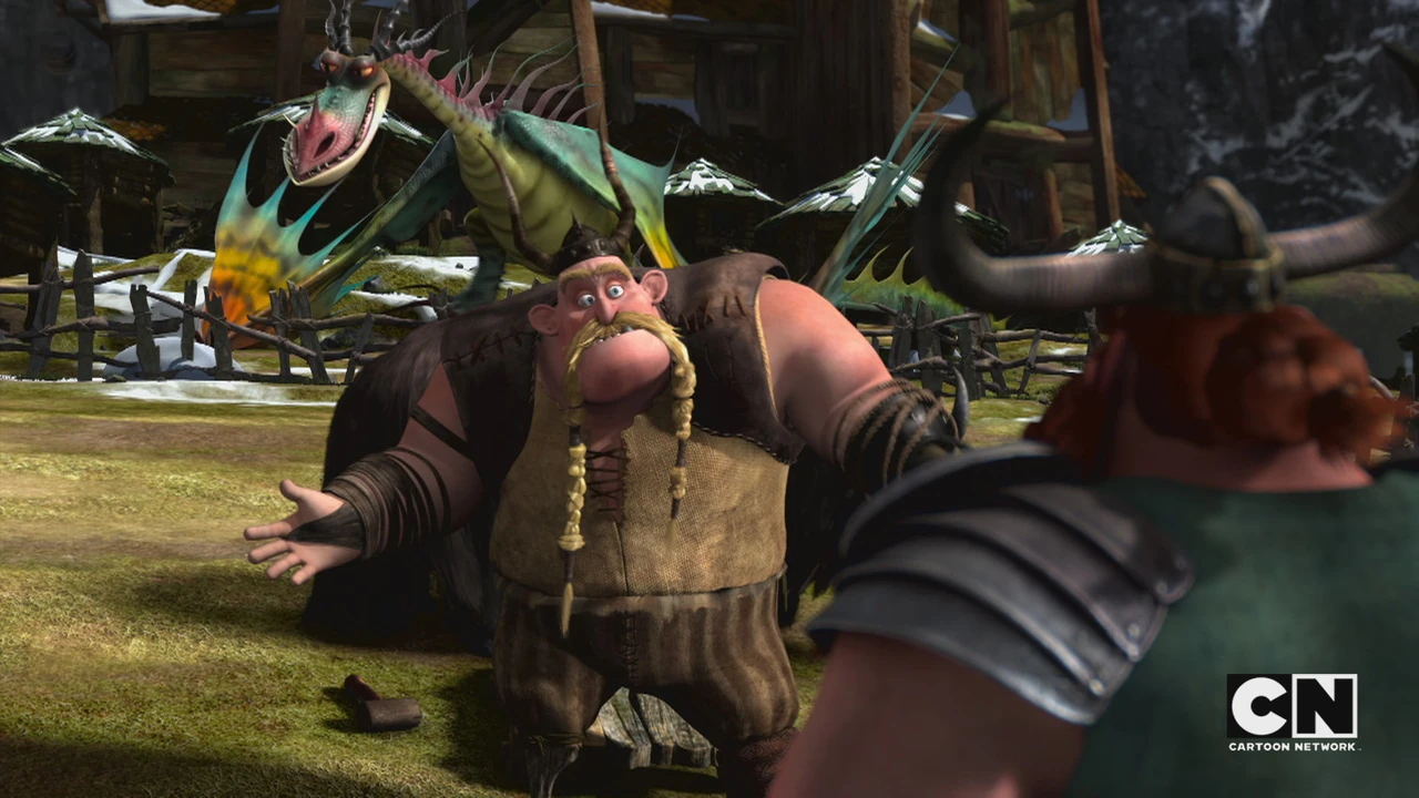 At the top of one of Berk's defensive catapult towers, Hiccup and Astrid sit with Fishlegs and Snotlout, recounting what happened. They state it was almost as though it were the dragons' instinctive nature to protect them. As Hiccup and Astrid comment on this, they're oblivious of how close together they sit. Fishlegs states they could have used their body heat to stay warm, which brings their attention to where they sit. Once more, they're embarrassed and shift away from each other. Snotlout, trying to either tease or flirt with Astrid, asks if she is still cold, offering a hug. Astrid rejects him by elbowing a support post, causing a snow drift from the catapult to fall on him. Ruffnut and Tuffnut arrive to deliver a message to Hiccup, saying his dad needs him and seems to be angry. Hiccup notes his father looked like that since the day he was born, and sarcastically states he's sure the two things have no connection.
