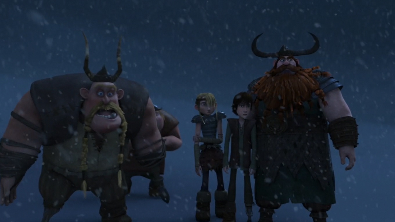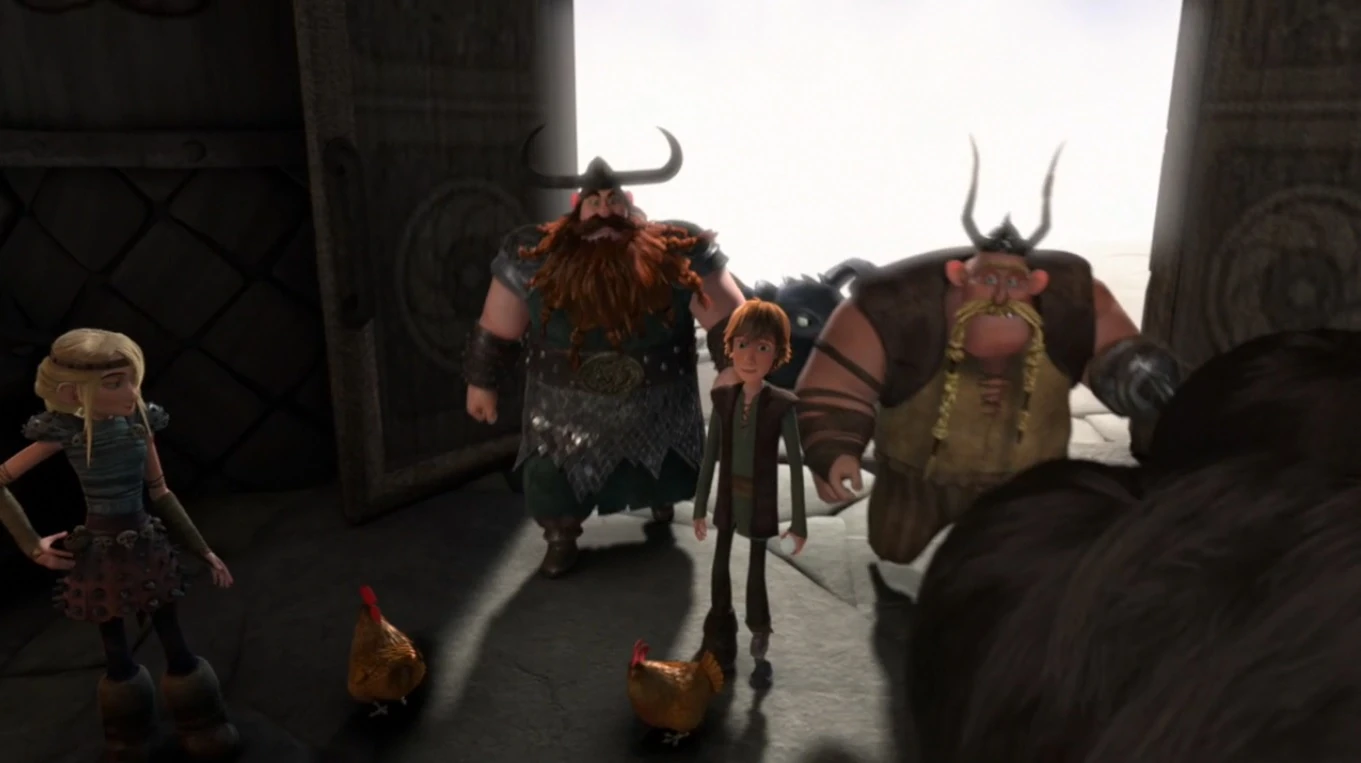Hiccup and Toothless arrive at home, to discover Gobber and Stoick request his assistance to help the animals get over their fear of the dragons before the winter storm comes. If the village becomes snowed in, they won't hunt or fish for months, leaving them dependent on the livestock for their survival. Hiccup repeats his father's earlier statement, saying they're still in the middle of winter, and a devastating winter isn't due for another month. Bucket and Mulch report in with an empty milk pail, saying they still got nothing after trying to milk one yak for three hours. Hiccup protests that the dragons aren't trying to be scary on purpose, and they don't even eat farm animals; they eat fish. Gobber points out to him dragons are also large, fire-breathing reptiles, which frightens the animals. Hiccup agrees and is at first given a week to fix the issue before the storm comes, but when Bucket cries out in pain again, Mulch recalculates the storm's arrival to be in three days and six hours.