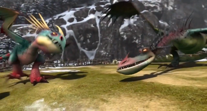 Meanwhile, Astrid and Hiccup are in the mountains, having a 'dragon-boarding' race, in which they slide down the mountain slopes on their dragons. When Astrid pulls ahead, Stormfly launches some of her tail spikes in an attempt to make Hiccup and Toothless slow down. In retaliation, Hiccup and Toothless pull ahead, and Toothless extends his right wing, blocking Astrid's view, and making it impossible for her to dodge a branch filled with snow, which hits her in the face. She protests, but Hiccup cheerfully feigns ignorance, saying he has no idea what she is talking about. Stormfly lets out a burst of fire, which melts a pile of snow in front of Hiccup and Toothless, causing them to temporarily spin out of control.