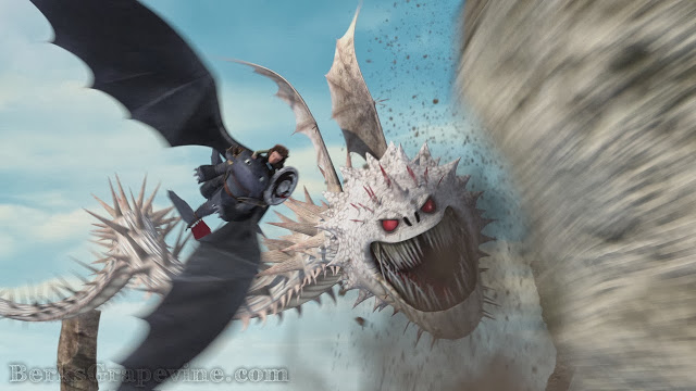 Hiccup and Astrid arrive only to see Boarhead Island gone too. The two then fly otherwise to Thor Rock Island, they see its devastated remains and Astrid begins to accept Fishlegs' theory about the wrath of the Norse gods. Hiccup and Toothless lands on the remains of the island to get a closer look. As they land, they see a huge marking that seems familiar but somehow different, Astrid asks how and Hiccup responds that they're bigger. Suddenly a loud roar is heard and rocks begin to tumble, and a huge dragon comes out of the huge hole and is actually the full-grown Screaming Death. The Screaming Death has grown bigger and disorients Toothless and Stormfly with its scream, the Screaming Death burrows underground and Hiccup figures out why the islands are disappearing: the dragon has been destroying all islands by tunneling underground and making the island collapse in on itself. Hiccup suggests they get a closer look, while Astrid is reluctant but Hiccup says that she did want to be dangerous. The Screaming Death suddenly closes in on Hiccup and Toothless and they fly away from the dragon. The Screaming Death, in pursuit of Hiccup, fires several blasts at them and destroys anything that's in his way. Astrid distracts the dragon by throwing some 'pistachio' paint tags at the dragon's eyes. While the dragon's vision is blurred, Hiccup and Astrid attack the Screaming Death and flee from the battle.