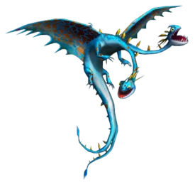 The "Barf and Belch's Offspring" individual seen in the game, Dragons: Rise of Berk , with the typical Hideous Zippleback shape, a medium blue base color with a pale blue belly, orange-spotted wings, and yellow horns and spines.