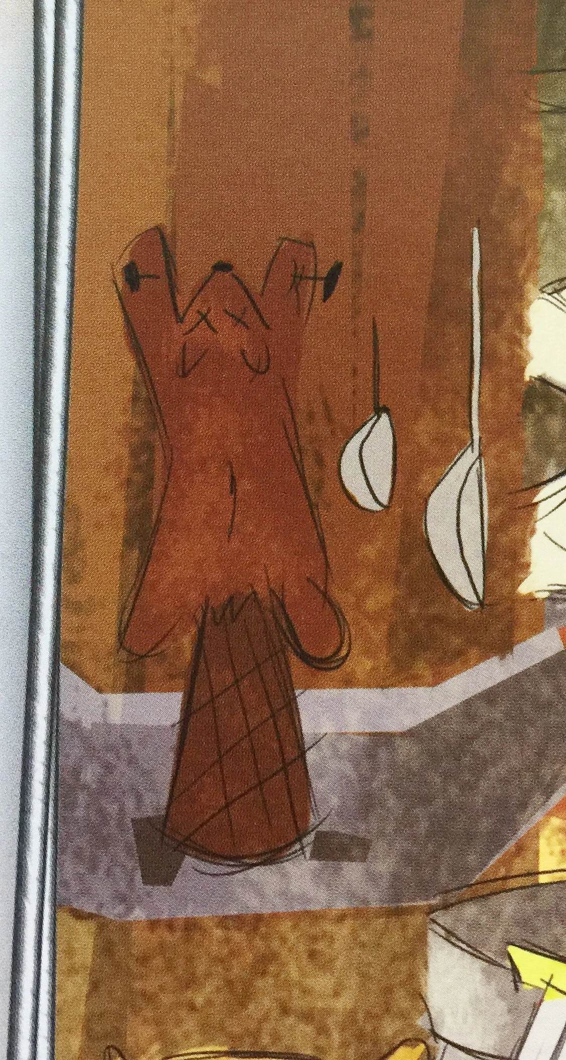 In this book, a dead beaver can be seen pinned on a wall in the background.