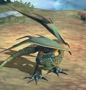In all respects, Brush Nadders appear the same as any other Nadders in morphology. Brush Nadders are turquoise, with blue, yellow, and green shades of scale colouring. They have pale yellow underbellies and yellow spikes lining their backs and tails, while the spines lining their heads fade to a pale turquoise at their bases. They have faint pink shades on their legs and on the edges of their wings, which are speckled liberally with small white dots and tinged with green. Their claws are dark purple and their eyes are yellow.