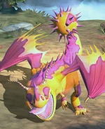 Brute-Wurst is a regular Snafflefang who has purple spots with a red-orange outline over an orange base. His claws, as well as horns, are brown. The upper half of his wings and spikes running down his back and tail are also purple.