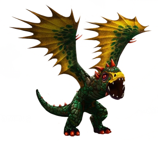The Brute Timbertoast is representative of its species. It is dark green in color with orange on the tip of its snout, the edges of its wings, the spines on its back, and the claws on its feet.