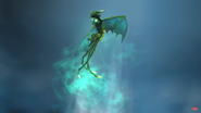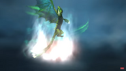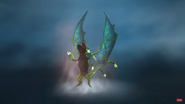 The Champion Triple Stryke, a Titan Wing Triple Stryke, stands out with its light green body and blue and cyan wings. Its spikes and stings are white. Unique to this dragon, it can shoot acid from its mouth and its three tails.