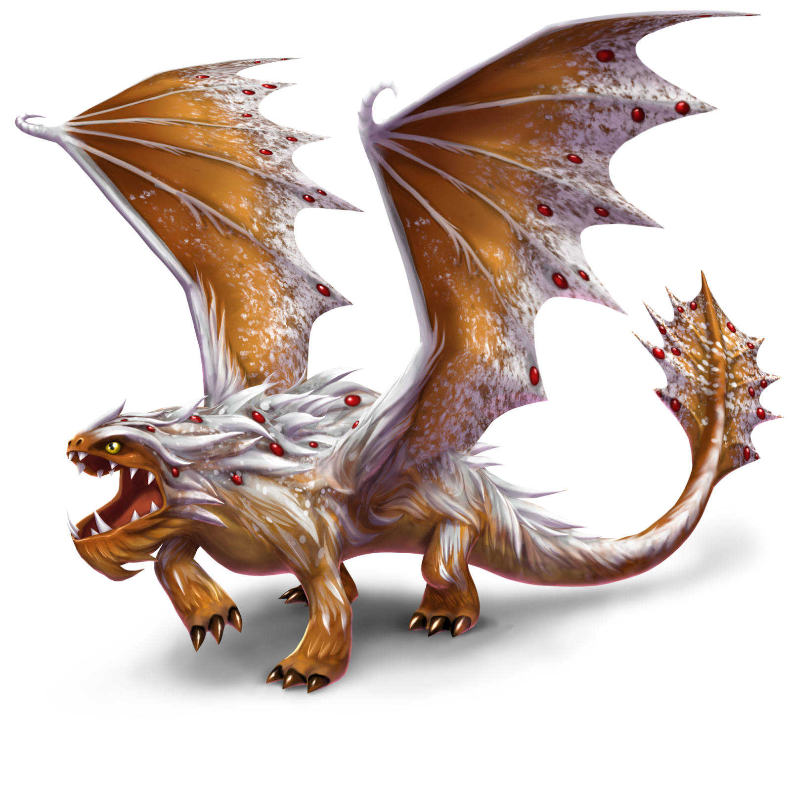 Crumbfinder is light brown, with white fur-like scales. His wings have white patterns that resemble snowflakes. He has red dots resembling Christmas decorations on his back, wings and tail fin. His eyes are yellow.