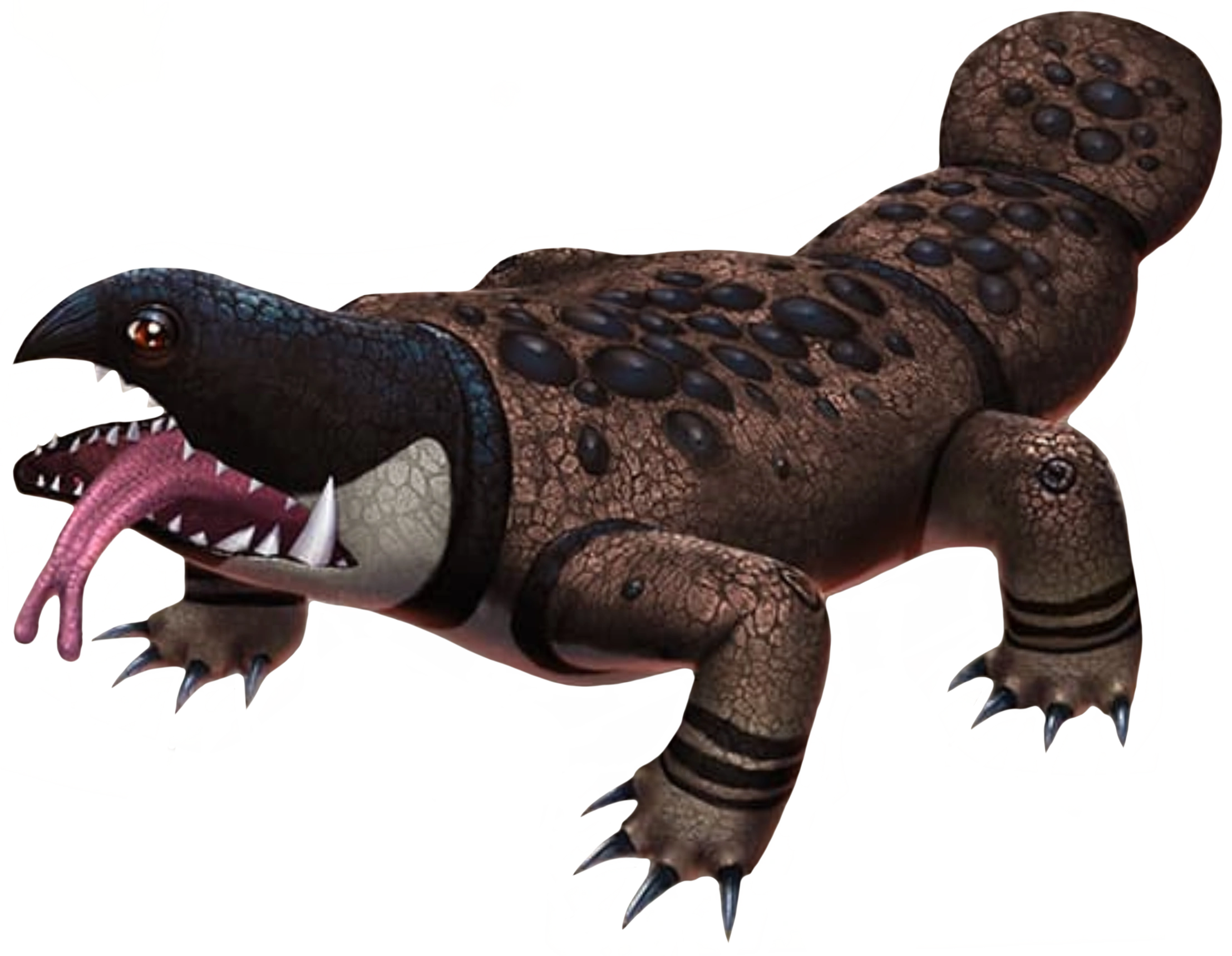 Crunch Muncher is light brown, with darker brown circles around his legs. His head is black and white, with the upper half being black and the lower one being white. His mucus glands are also black. He has amber eyes and a bright pink tongue.