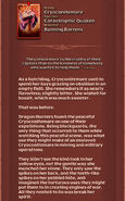As a hatchling, Cryoconitemare used to spend her days grazing on obsidian in an empty field. She remembers it as nearly flavorless; slightly bitter. She wished for basalt, which was much sweeter. That was before.Dragon Hunters found the peaceful Cryoconitemare on one of their expeditions. Being blackguards, the only thing that occurred to them while watching this peaceful scene, was what use they might make of an enslaved Cryoconitemare in mining and military operations. They didn’t see the kind look in her yellow eyes, not the gentle way she munched her stone. They only saw the spikes on her back, and the teeth-like spikes on her pebbled hide, and imagined the torturous uses they might put them to in creating engines of war. All they needed to do was break her spirit. It wasn’t easy, but they eventually designed a method to trap the Cryoconitemare using a trail of juicy basalt leading into a cage trap. They captured her and mistreated her until she was so used to pain that she did whatever she was told out of fear of punishment. Her kindness learned to hide deep beneath a thick skin of numb toughness as the Dragon Hunters used her as a wrecking ball to mine marble from their quarry. There she would have died if it weren’t for the Dragon Riders of Berk . They rescued Cryconitemare and her companions from their lives of slavery and freed them from the chains that bound them. Cryoconitemare returned to her barren field. She has scars. She has a missing claw. She has memories of times she would prefer to forget. Today she munches on her obsidian with delectation. It is now the sweetest flavor she can imagine.