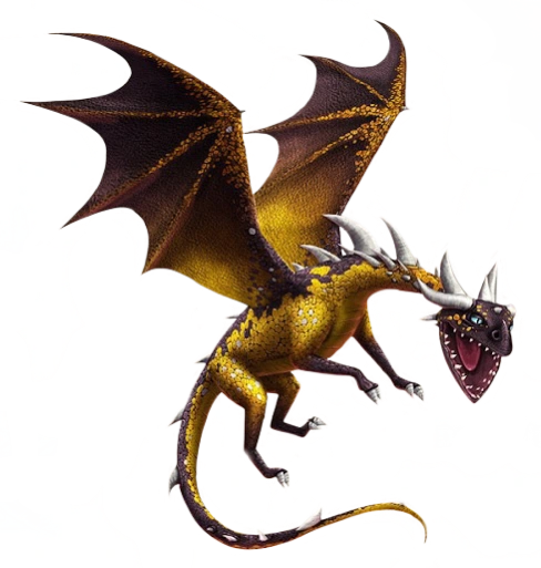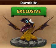 Dawnbite is golden yellow, with a brown head with brown fading on wings, legs and body. It has golden shades on its wings and small white spots on its sides and tail. It has a brown line down on its back and few briwn spots on its fave. It has white spikes, horns and claws and light blue eyes.