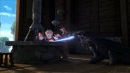 Later on, while attempting to search for a Buffalord on Odin's Respite in order to save Astrid from the Scourge of Odin, the Riders came upon an area of the island that was exposed to extremely bright sunlight. Unable to see, Snotlout assumed that there was nothing in front of them. However, Hiccup was able to exploit the glasses to cut through the glare and see the nearby Buffalord, which was using the sunlight to hide in. After letting the rest of the Riders know that something was there, Hiccup gave the glasses to Snotlout, who was able to see the Buffalord for himself.