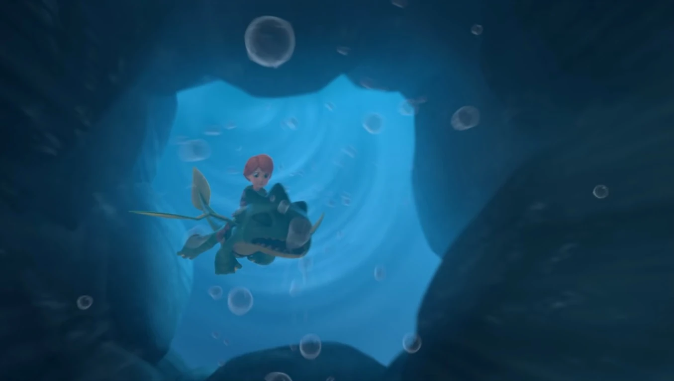 The Riders find a whirlpool created by the Divewings and assume the dragons went inside. Leyla and Summer dive into the water, while the others wait for them at the surface. Summer is disoriented at first by the current inside the whirlpool, but manages to stay in it. She and Leyla end up in a cave, where they are thrown out of the water. Looking around, they wonder where they are. Fathom and Gill emerge from behind some rocks and growl at them.