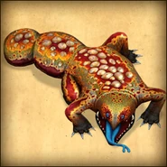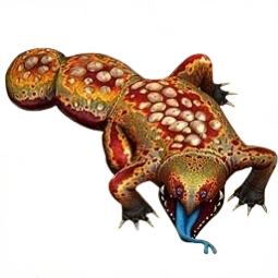 This dragon is olive, with reddish brown and orange blotches on its back. Its bumps are grey in color. It also has a blue forked tongue.