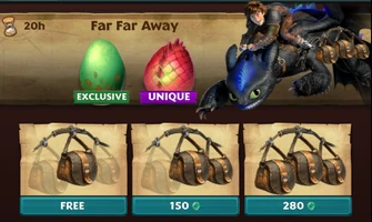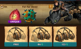 Far Far Away is the fifteenth area of the Barbaric Back-Country the player encounters. Several wild dragons reside here that the player must fight in order to advance in the game. Dragons seen here include but not limited to: the Deadly Nadder, Hideous Zippleback, Monstrous Nightmare, and Thunderdrum.