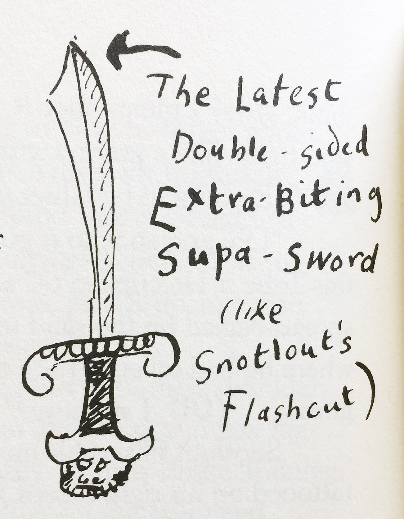 | “ | Wow," breathed Speedifist. "The latest Double-Sided Extra-Biting Supa-Sword. Curving inner edges, silverpoint finish ... where did you get THAT from, Snotlout?" "This is the Flashcut," boasted Snotlout ... "Makes that silly Swiftpoint Scaremaker ... look pretty weak, doesn't it, Hiccup? |