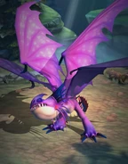 Fog-Stalker possesses a body with scarlet details that stand out from her magenta and purple base and wings mottled with faint white spots. She has yellow eyes and a light beige underbelly. Her crown of spikes and claws gradually turn into dark blue toward the tips.
