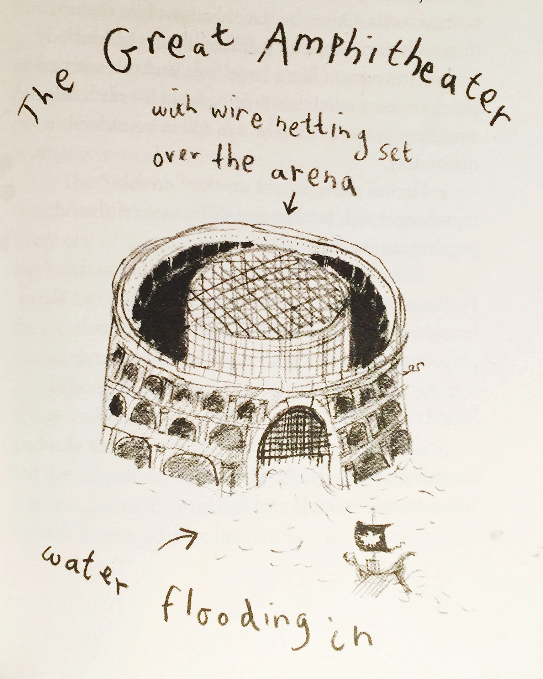 The Great Amphitheater is a place which hosts regular gladiator fights and other spectacles. The Arena can be dry or flooded, and it has at the top a metal grate, preventing the escape of dragons (the walls are still too high to be able to escape from it people). Around the arena stands a huge auditorium, which can accommodate thousands of Romans.