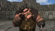 Fishlegs enters the ring to face a Gronckle. The dragon lays down to rest. Fishlegs dumps a bucket of water on it head, however, he finds out it was the dragon's tail instead.