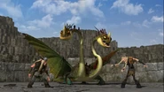 Ruffnut and Tuffnut rush into the ring to confront a Hideous Zippleback, banging their weapons on their shields and running around. This confuses the dragon for a moment, but then the Twins start arguing with each other, allowing the dragon to grab them by the heads.
