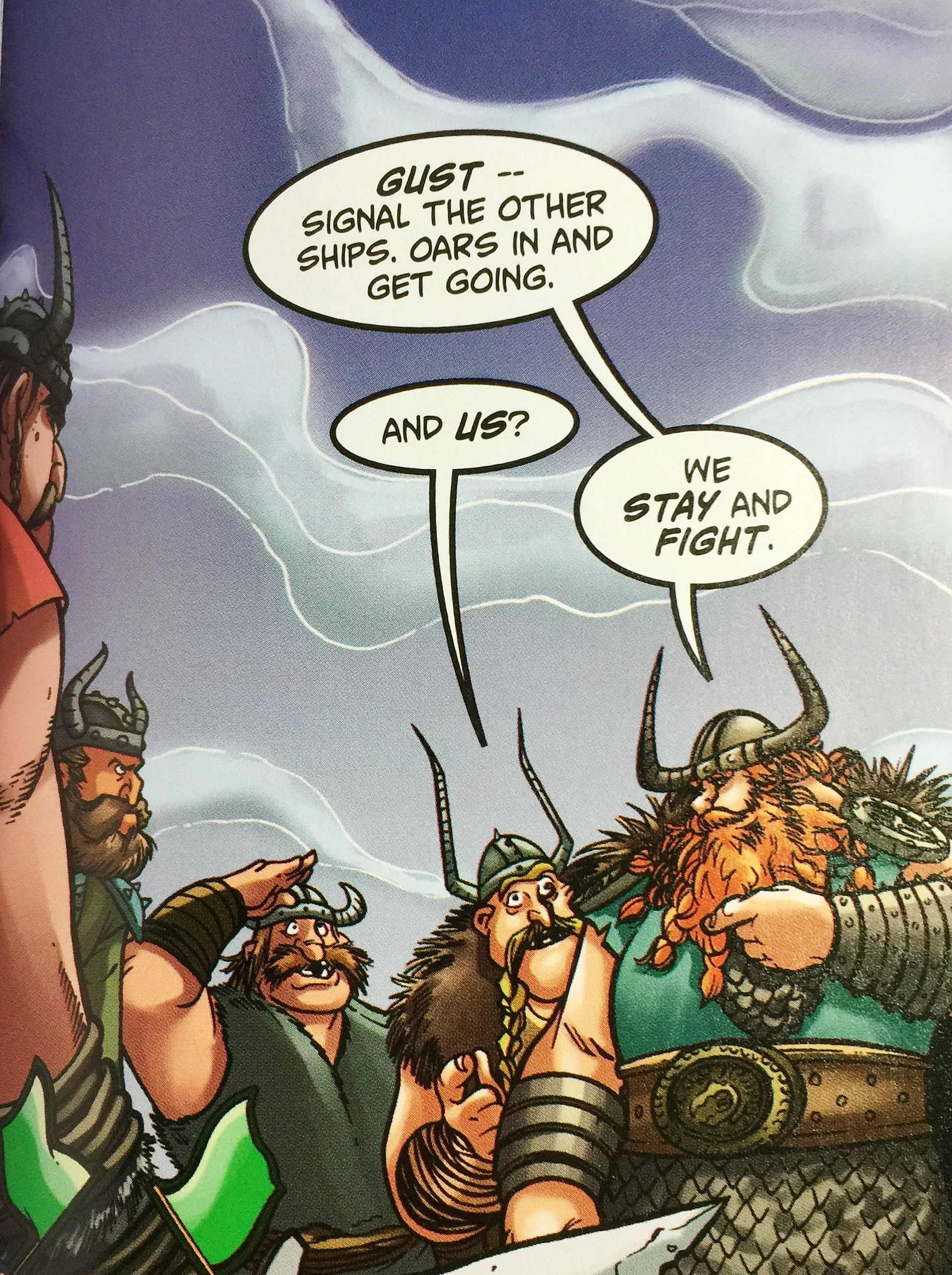 In the Comic, "Dangers of the Deep", fishermen are turning up with little to no fish for the Hairy Hooligan Tribe to eat. Chief Stoick decides to take all able-bodied tribesmen out to sea into the Veil of Mists in search of fish. Thick fog surrounds the Hooligan ships as they enter and the sailors can see something stalking them in the water. Stoick instructs "Gust - signal the other ships. Oars in and get going." The creature stalking them turns out to be a Submaripper.
