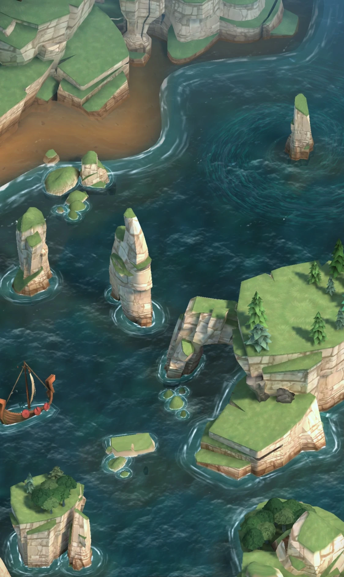 Hamish's Sea contains many sea stacks, some large enough to be considered small channel islands, and have vegetation such as grasses and the occasional tree. One particularly large island even has dark sandy beaches lined with cliffs.