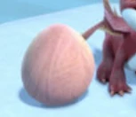 Hideous Heatwing eggs are ovoid like a standard chicken egg, without any special features such as spikes or other extraneous adornments. The color is a rosy tan with subtle striations of darker color, reminiscent of wind blown desert sandstone. The interior of the egg is a warm golden color.
