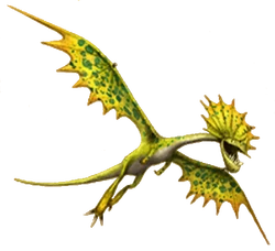 Hobblegrunts are colorful creatures. These dragons are bipedal, but they have two small forelimbs with long claws. They have long, but surprisingly strong, thin necks. Their heads are large, with a big jaw that has an underbite, showing their many teeth. They have a small nose horn, in the front of their heads with their eyes just behind the horn. At the back of the skulls, they have a massive fin that acts like a giant radar. They can move this fin to better perceive their environment. Down their back, they have short spikes. Their bodies are long, but their large tails help them balance whilst on land. The tail ends in a fin that helps for stabilization during flight. It has clawed wings, small arms and big legs, much like a Deadly Nadder. Its tail has frilled edges, similar to that of a Monstrous Nightmare. The Hobblegrunt doesn't have a particular color, but instead it changes color depending on its mood: