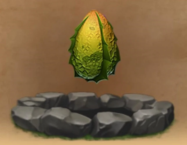 In School of Dragons, the egg is oval and has different shades of brown and grey. It has several orange spots and a row of fin-like structures protruding from the top of it, reminiscent of a crown.