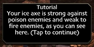 The Ice Axe is composed of a wooden handle and a curved base onto which Shivertooth teeth are attached with what appears to be leather cord. It has "frost" ability, which means in the "Dragon-Tactics" mini-game it is powerful against poison and weak against fire.
