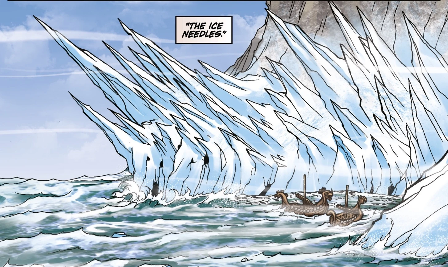 The Ice Needles is a location seen in the Riders of Berk comic, "The Ice Castle", and is located on the coastline of the Northlands.