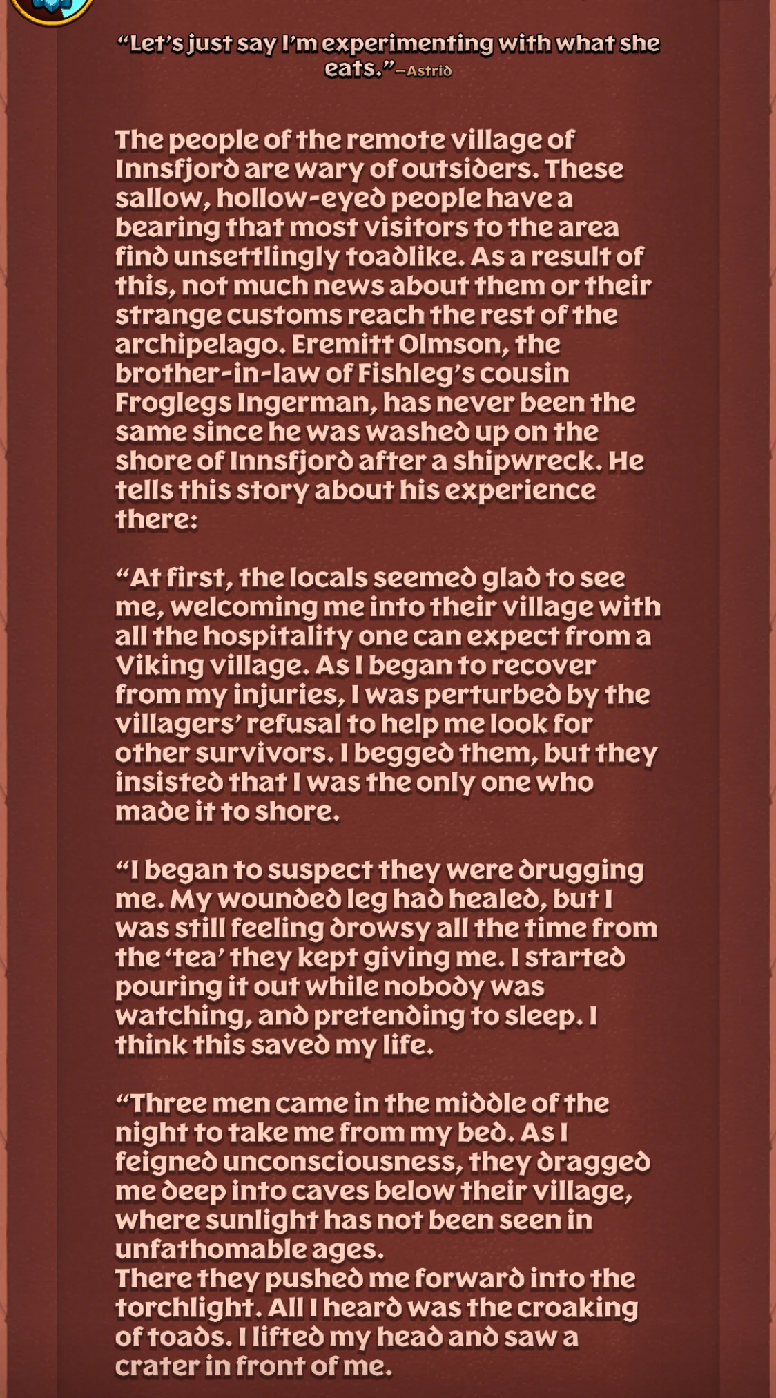 Eremitt Olmson once shipwrecked on the shores of Innsfjord. He was treated by the residents of the island, who intended to sacrifice him to the Deathburple known as the Eldritch Deathnettle. However, Eremitt managed to free the dragon and escape from the island, even though the trauma followed him.