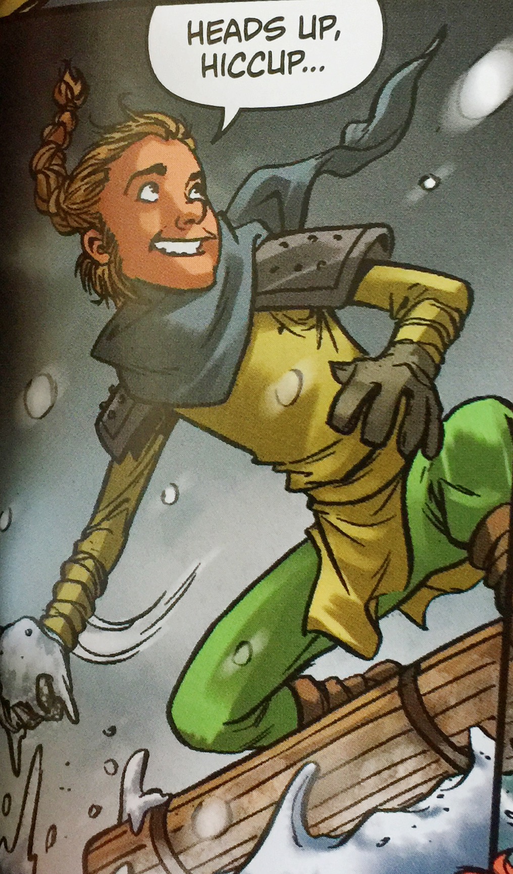 However, his clothing color does not remain consistent throughout the comic - at times his scarf appears red and potentially confused with Astrid in the comic at a distance, as she is also wearing a red scarf.