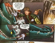 As Chilblain and its people are threatened from the impeding volcanic eruption, Hiccup has an idea of utilizing the Dragons that were attracted to the volcano to help save the village. He grabs Kettil and flies away with him on Toothless into the volcano. Having been raised with snow and ice, Kettil is not even sure what magma is. Hiccup lands and takes Kettil on a fast course to training a dragon. They slowly approach what appears to be a Skrill resting on a ledge, offer a treat, then Hiccup grabs Kettil's hand and places it on the Dragon, forming a physical contact. Kettil then rides this dragon for the rest of the Comic and saves his people.