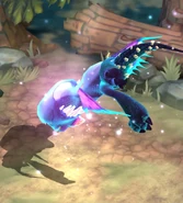 The Lethal Lancebeak has a base of purple with several turquoise scales and a white underbelly. Her distinguishable features include the extra spikes on her jaw and the three small hooks at the end of her wing joints, which are a gradient of yellow and pink like her crown of spikes on her head.