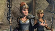 Nadia is of the typical Wingmaiden build — slightly stocky and square-jawed. She had a brown toned skin complexion and dark blonde hair, kept pulled back. Nadia's features are thick, brusque and dark, with thick eyebrows and a heavy set mouth. She wears the standard Wingmaiden armor dress and carries a spear.
