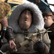 The next day, the trappers shot down a Deadly Nadder and met Hiccup and Astrid. Like the others, he was fascinated by Hiccup's dragon blade. Immediately, the two were assumed to be working with the other rider from the night before, though the Viking couple were quite confused about the ordeal. After Eret explains they work for Drago and need to deliver a new batch of dragons by tomorrow, the trappers tried to capture Toothless, but ended up losing Stormfly, and the Vikings.