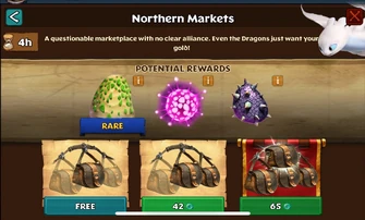The Northern Markets is mentioned once in a September 2017 Gauntlet Event. Apparently, according to Fishlegs, the Twins visit the Market and purchase a Skrill egg, in order to start a singing band.