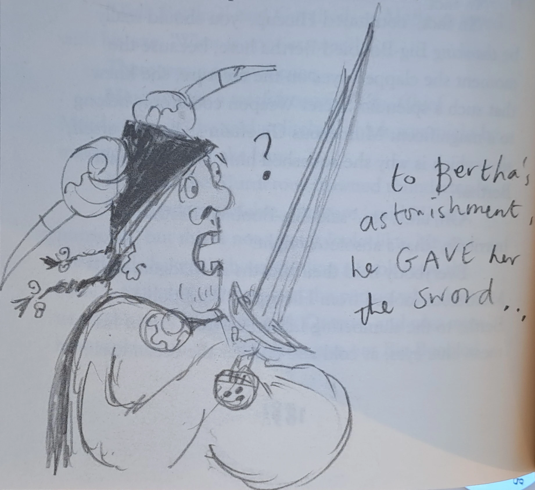 While interrogating Big-Boobied Bertha about stealing his Stealth Dragon, Madguts the Murderous wielded the Number Six Sword in order to intimidate her. However, upon hearing that the woman was arresting the Hairy Scary Librarian, the real thief, he gifted the sword to Bertha.
