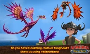 Monstrous Nightmare : Baldreng • Blazewing • Blazing Phoenixfire • Brisket, Saddle, Chuck, Rump, Loin, Scrag, Cutlet, Ham Hock, Sausages, Offal, Knuckle, and Pot Roast • Burlystorm • Cagecruncher • Cawmour • Charsoul • Defender Monstrous Nightmare • Exiled Monstrous Nightmare • Fanghook • Fangmaster • Firescrapes • Flick • Girl Hookfang • Hookblazefang • Hookfang • Hookfang's Mate • Hookfang's Nemesis • Hookfang's Offspring • Hookfire • Liberated Whip-Wreck • Merciful Nightmare • Mountain Nightmare • Munchauser • Nidhogg • Nightmare Tyrant • Sven's Nightmare • Valka's Mercy • Whip-Slash