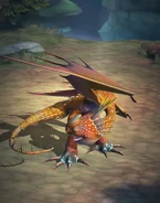 Pincher's body color is a combination of pale cyan, orange, and yellow with a light beige underbelly; his main body color is orange with purple coloring on his wing edges and on some of his scales. His eyes, as well as the edges of his crown of spikes, are yellow. The small hooks at the end of his wing joints and claws on his feet are woody-brown.