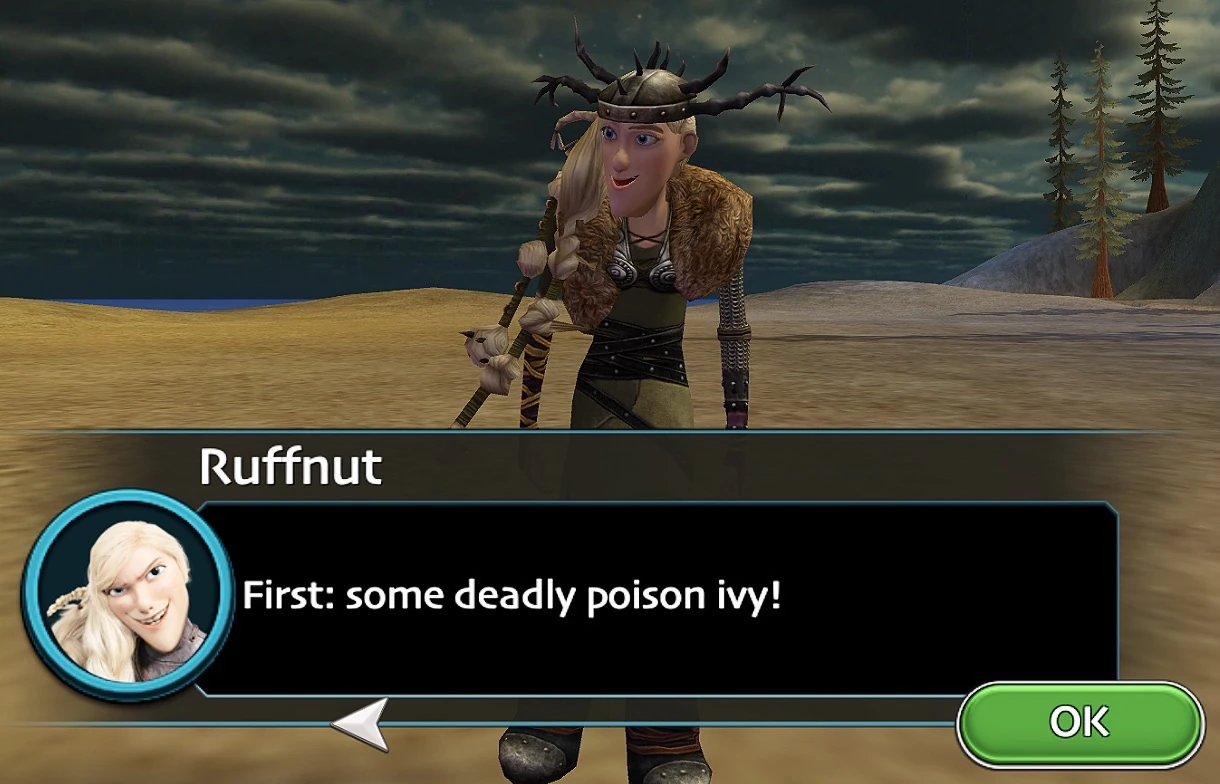 During the Thawfest Daily Quest "A Unique Lei", Ruffnut asks the player to collect three toxic plants to create a 'unique' lei, including Poison Ivy, Hemlock, and Wolfsbane. The player decides to bring her bright red flowers instead, hoping to placate her. She accepts the substituates because they remind her of the color of blood.