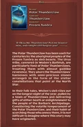 The Polar Thunderclaw has been used for centuries by the aboriginal peoples of the Frozen Tundra as sled beasts. The Uruz Tribe , centered in Woden's Bathtub , are particularly fond of Polar Thunderclaws, treating them with almost god-like reverence. They adorn the Thunderclaws' harnesses with semi-precious stones arranged in the form of the stellar constellations that point at the North Star. In their folk tales, Woden's sled rides out on the longest night of the year, pulled by a team of Thunderclaws and delivering gifts of either death or enlightenment to the people of the Barbaric Archipelago . Considering the volatile temperament of the Polar Thunderclaw, and their habit of scorching those who annoy them, it is not difficult to imagine where this story may have originated.