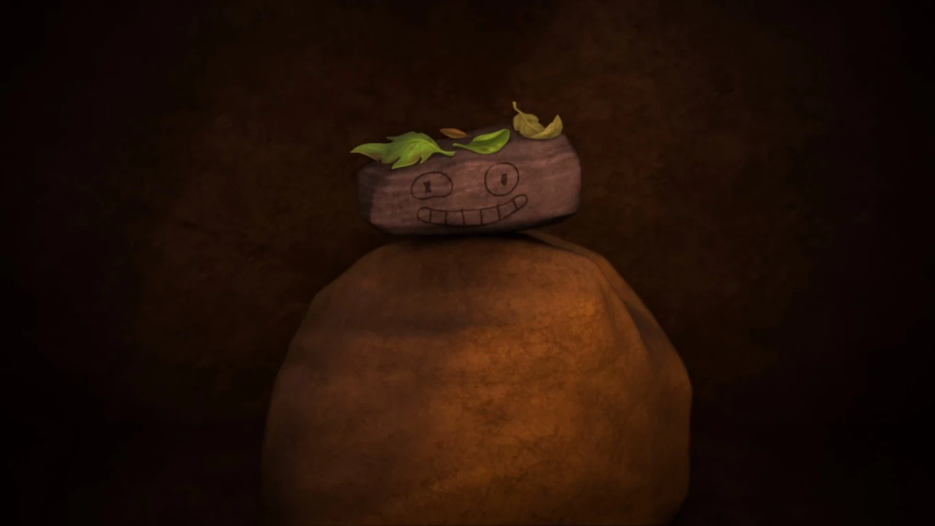 Rocky is an oblong greyish rock with eyes and a mouth drawn on it.