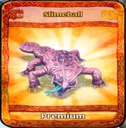 Unlike a typical Cavern Crasher , Slimeball has several horns and tendrils on his head. He is a purple-pink color with lavender mucous warts. He also has a bright blue, forked tongue, as well as blue eyes.