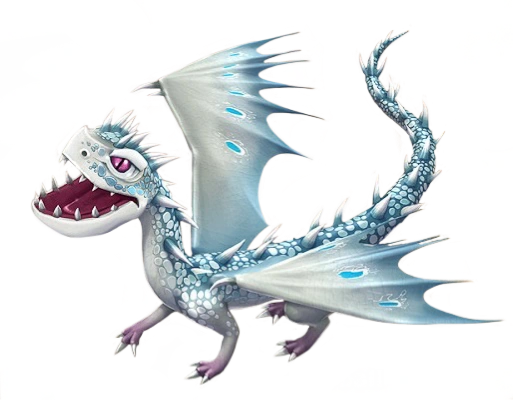 Snowball is white with dark blue shades on her back and wings. She has light blue spots on her wings surrounded by white circles. She has pale pink legs, similar to a mammal. Her claws and spikes are white and her eyes are dark pink.