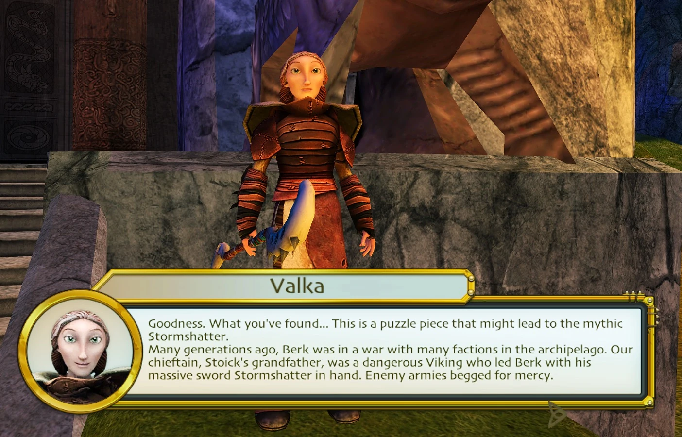 Several centuries later, Eret, Son of Eret, while searching through a collection of Berk goods that he had stolen from a group of Dragon Hunters on Auction Island, came across a piece of parchment that contained a strange prophecy that seemed to refer to Stormshatter. Upon learning about the history of the sword from Valka, the player sought to find the rest of the clues in order to find the pieces of the sword before the Dragon Hunters did.