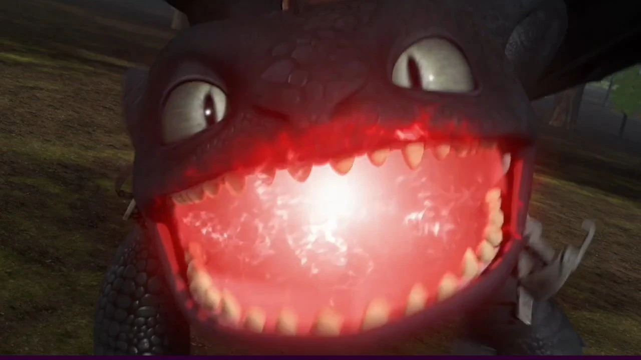 Back at Berk, the Riders have returned to the Great Hall. Stoick asks if they have the ingredients, and Fishlegs answers that Hiccup has them. Stoick asks where he is; they tell him they don't know and begin to worry, as the infection becomes worse; the symptoms have worsened by making them confused and makes them change their personality like Gobber who claims that he is Gobber's Great-Auntie Roseworns and wants to give him a kiss. They are disgusted by the new personality and sees what Stoick was pointing at. The confused Gobber annoys and harasses Stoick who angrily shouts at him to stop. Meanwhile, Toothless runs deep into the forest unable to see straight, such as being hit by a tree and tripping over a log. The eel worsens Toothless' senses such as his hearing, even small sounds such as the sound a fly makes irritates him and makes him more paranoid. He is surrounded by noises and becomes heavily delusional. Suddenly he coughs a burst of somewhat red fireballs that make a critical impact when fired. Hiccup is able to locate him, but Toothless tries to resist his cough and fires the fireball as far as possible, and a huge explosion erupts. Hiccup is shockingly amazed at the dangerous fireball and figured out why dragons go easy on the eels. Toothless' continuously coughs and shoots red fireballs all around the area without warning. Hiccup backs up and takes cover and waits for Toothless' six shot limit. When it finally hits six, he closes on Toothless, only to be discovered that the eel has increased his shot limit and is able to fire multiple shots. Hiccup tries to dodge the attacks.