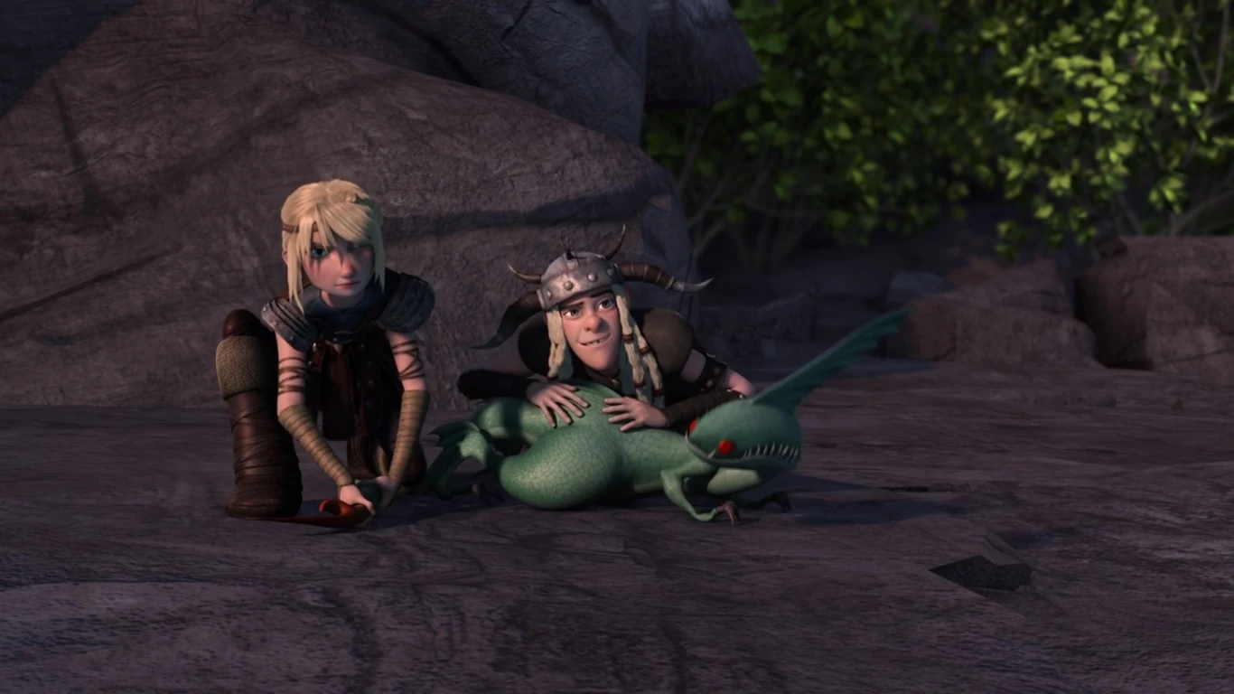 When they observe the young Speed Stinger's condition, they conclude that he is defenseless after being separated from its pack. A few hours later, Hiccup plans to nurse the dragon, bring it to their main quarters, and later return it to where they found it. Hiccup must first place a splint (which is spare parts from his flight suit) on the Speed Stinger's injured leg before they can bring it to Dragon's Edge, so he assigns the Twins to secure its tail when it tries to resist. However, the Twins do it in a different way, hilariously they secure the Stinger's tail by mocking it and daring it to attack them. This irritates the Speed Stinger, causing it to sting Ruffnut, but only paralyzing her upper body in which her lower half remains functional, Fishlegs observes that young Speed Stingers don't yet have the full potency of paralysis when it is still an adolescent, it can only paralyze a part of its victim's body at a time.