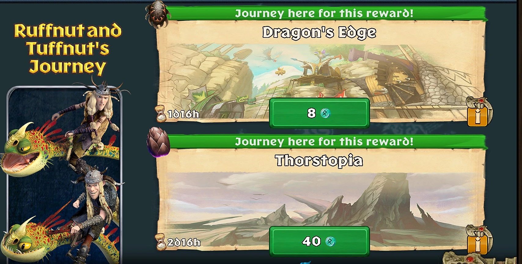 Thorstopia appears as a Journey activity for Ruffnut and Tuffnut, once Barf and Belch reach Level 90. In addition to Runes, Iron, and Collection items, the play may find eggs of a Threadtail, Windgnasher, or a Thorstopian - a Razorwhip who lives on Thorstopia.
